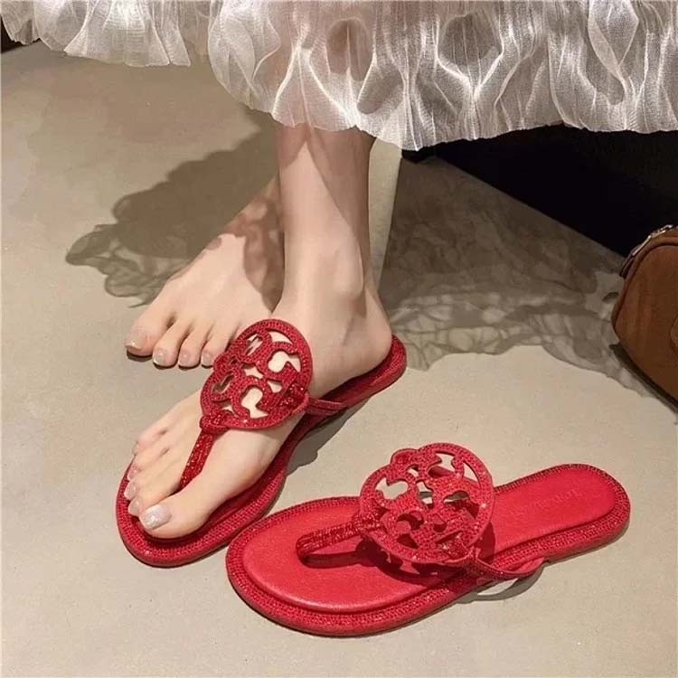 Tory Bury New diamond flat bottom women's slippers ins fashionable beach thong toe rivet rhinestone flip flops-2330